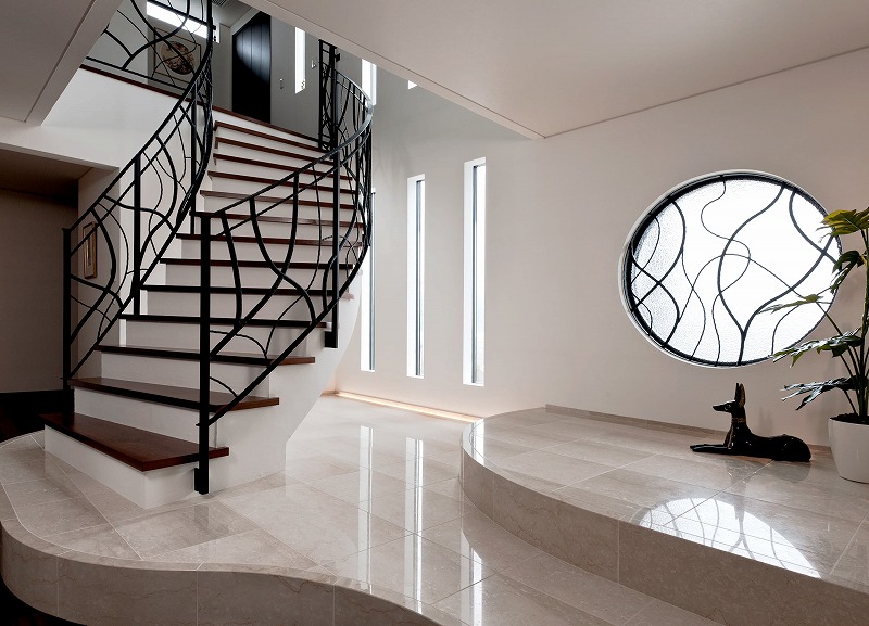 玄関扉を開くとする目に入る円形の窓。ロートアイアンの美しい曲線美で飾られた面格子がとても素敵です。階段手すりのロートアイアン装飾と調和してとても美しい空間です。